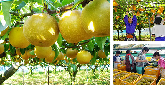 やさとのなし栽培は、明治初期に始まり、土壌条件や気候条件および大消費地東京から70km圏内に位置する地理的条件に恵まれ、現在、幸水・豊水・新高 が主な品種で、栽培面積170haを有し、県内有数の赤なしの産地です。平成3年にJAやさと梨部会が誕生し、生産技術の向上、品質規格の統一、組織の統一、販売流通の改善など整備が図られ、平成4年5月に茨城県青果物銘柄産地に指定され、3選果場の機械選果による出荷体制も充実しています。簡易ハウス栽培技術の導入による前進出荷から新高等の晩生種までの長期出荷や多目的防災網の設置、フェロモン剤利用による低農薬栽培の推進、有機肥料の投与等、品質の高位平準化に努め安全性の高い、美味しいなしを安定供給している産地です。